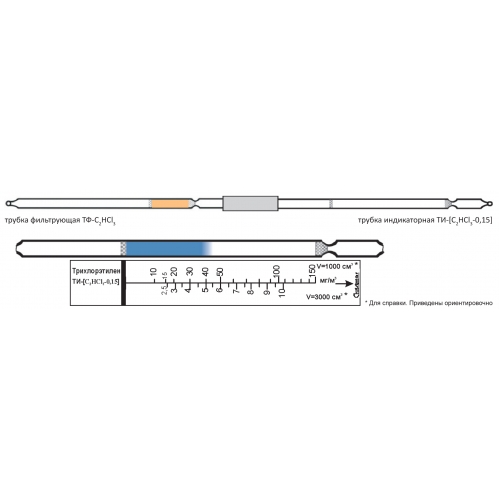 Описание: ТИ-[С2НCl3-0,15] представляют собой комплект, состоящий из двух трубок – трубки индикаторной ТИ-[С2НCl3-0,15] и трубки фильтрующей ТФ-С2НCl3.