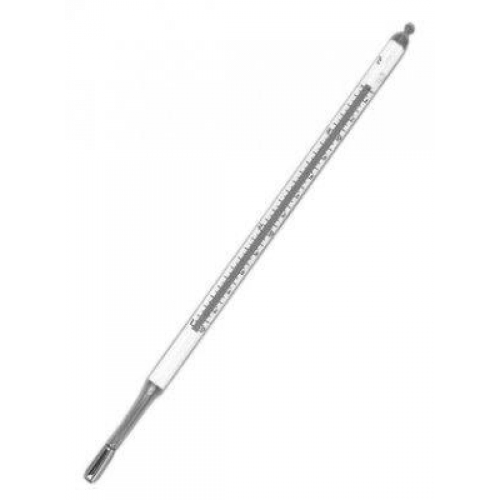 Стеклянный термометр с вложенной шкальной пластиной из листового стекла молочного цвета.
