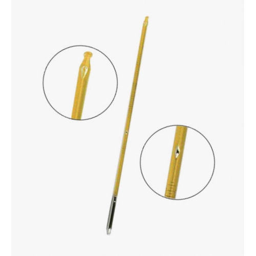 Изготовлен термометр в виде трубки-капилляра, заполненной ртутью. Корпус оптимизирован для установки в специализированные приборы. Мерная шкала размещена на самой трубке. На верхнем конце имеется массивный стеклянный шарик или плоский выступ, за которые термометр удобно держать.
